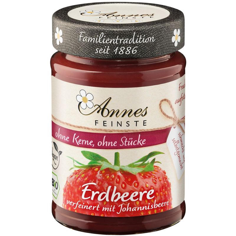 Erdbeer-Konfitüre, die Lieblingssorte der Deutschen, gehört für die meisten unbedingt zu einem guten Start in den Tag. Der neue Fruchtaufstrich Erdbeere ist mit roten Johannisbeeren verfeinert. Das Ergebnis ist ein wahrer Aroma-Schatz, der pure Sommer, eingefangen für den täglichen Hochgenuss am Frühstückstisch. Für diese Fruchtspezialität ohne Stücke, ohne Kerne kommen ausschließlich Erdbeeren aus deutschem Anbau ins Glas.