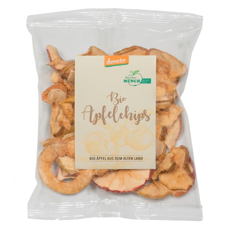 Bio Obst Münch Bio Apfelchips Demeter zertifiziert. Knusprige fruchtige Apfelchips aus 100% Demeter -Äpfel vom eigenen Obsthof aus dem Alten Land. Ohne Zusatz- und Geschmackstoffe. | bio123